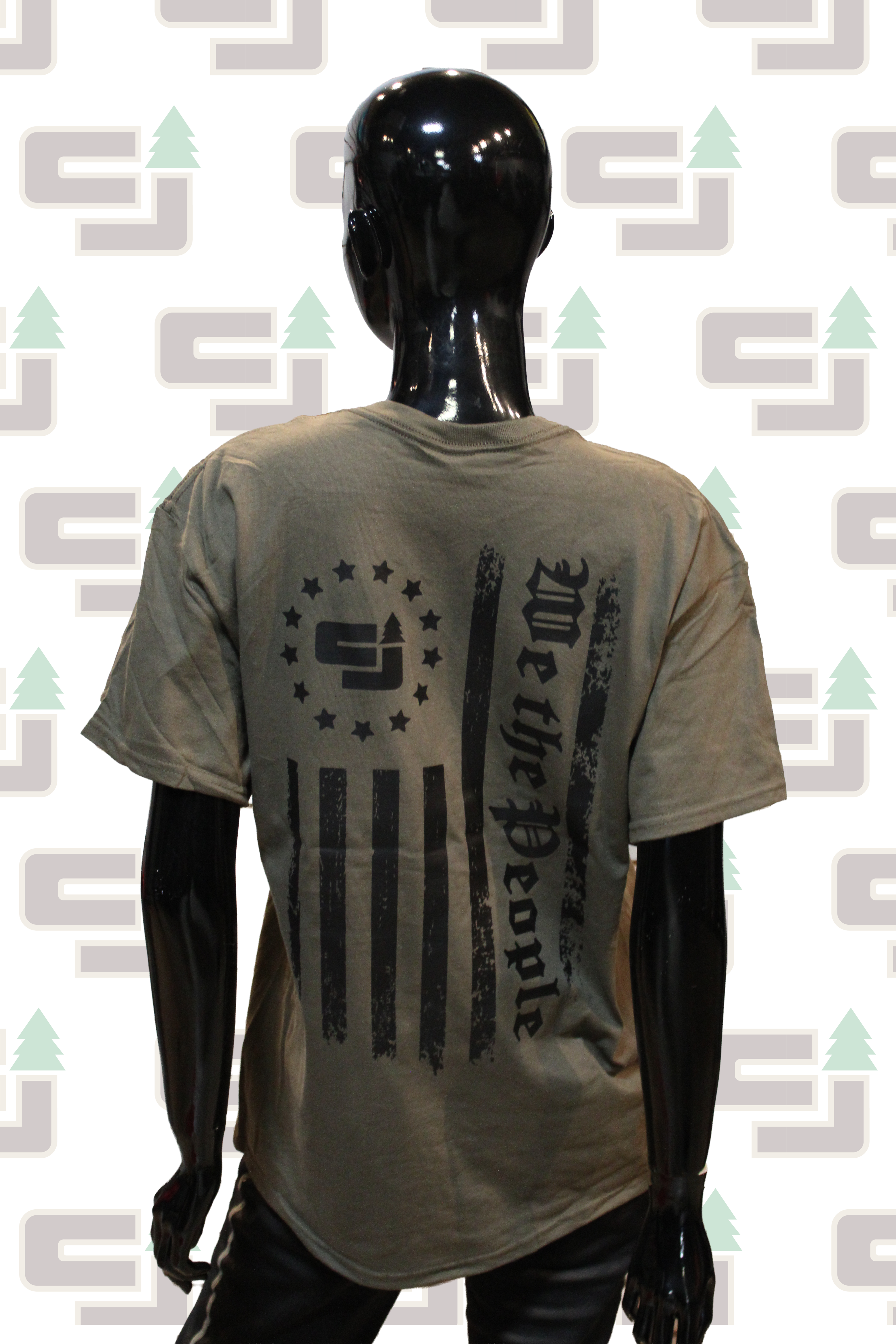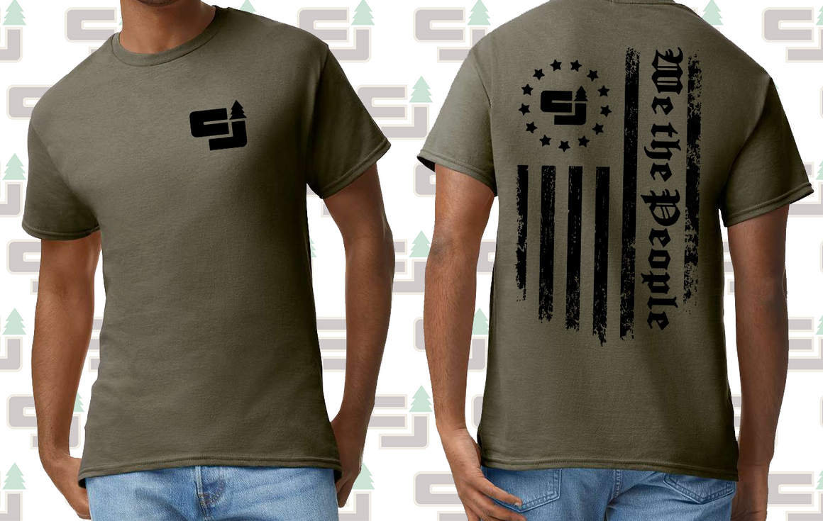 Dark green colored T-Shirt. Includes the CJ Logging Equipment logo on the front in black, and "We the People" artwork featuring the CJ Logging Logo on the back in black.