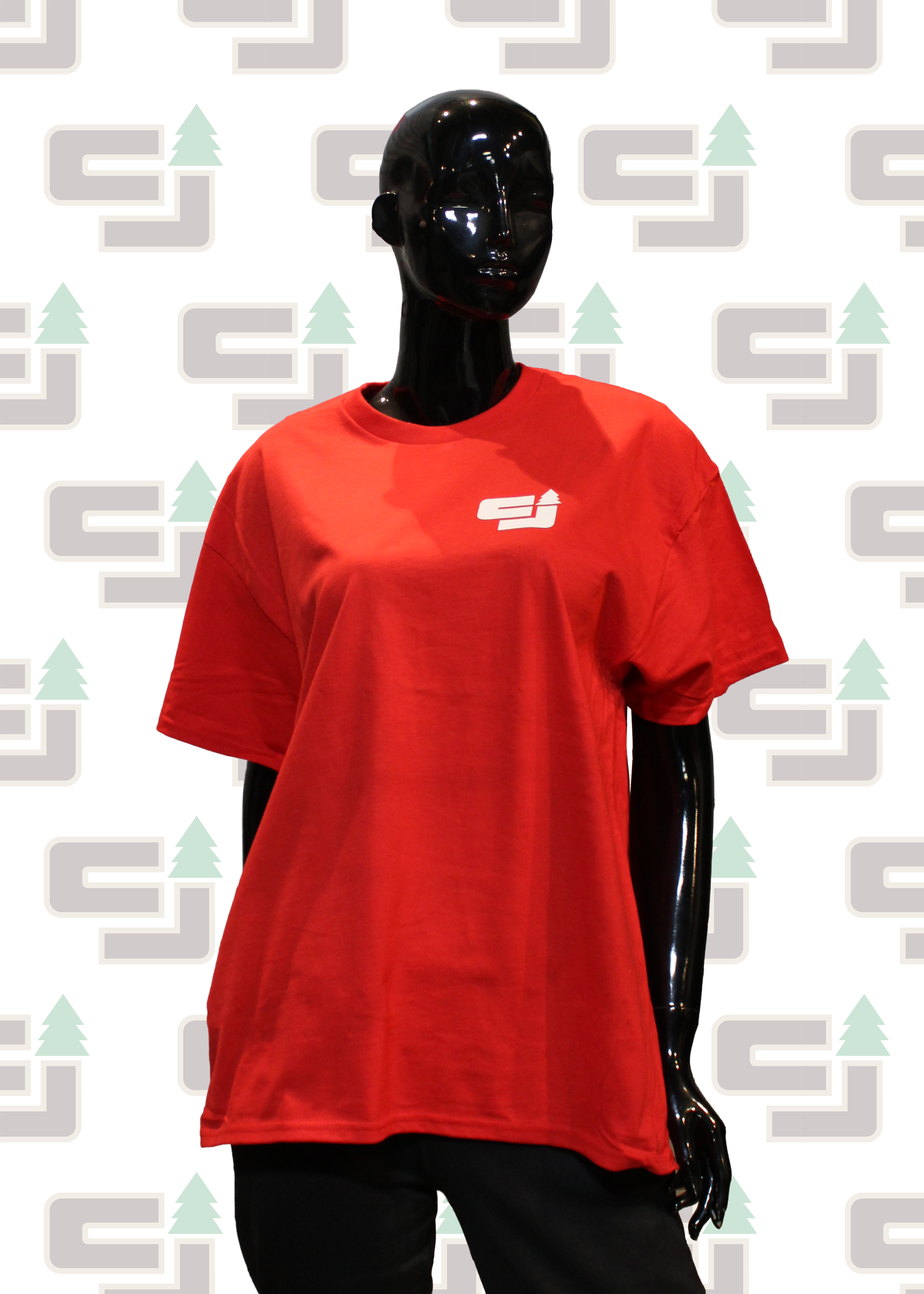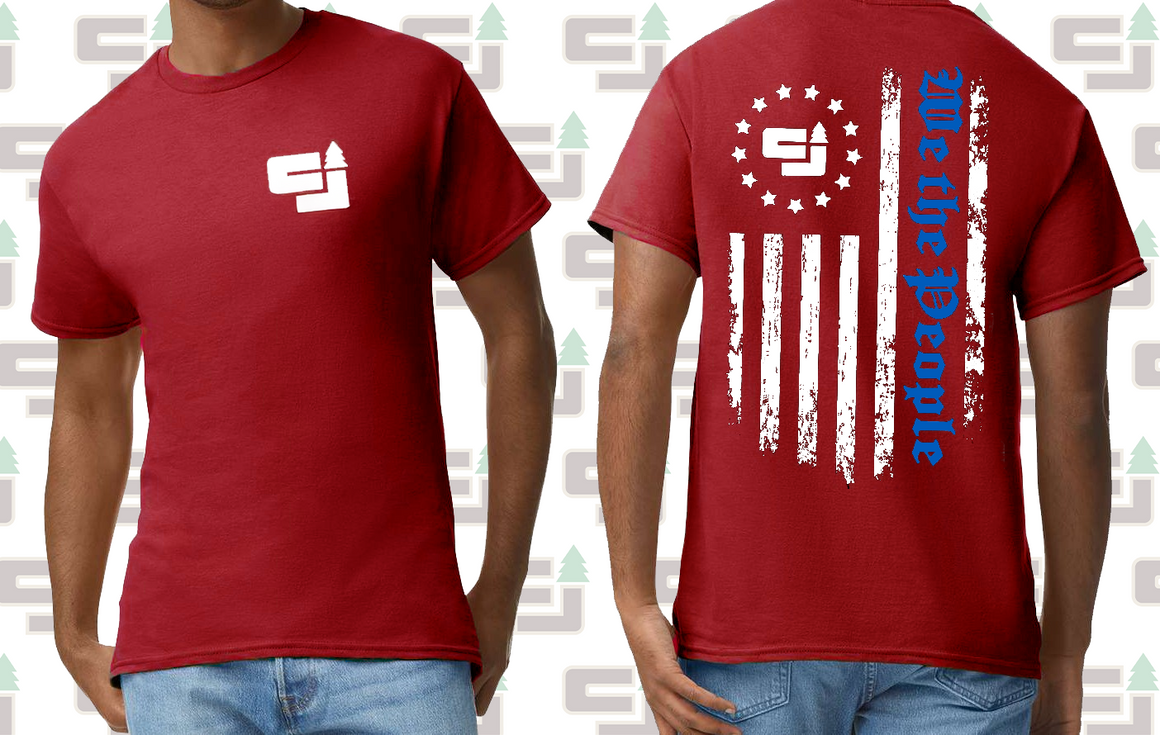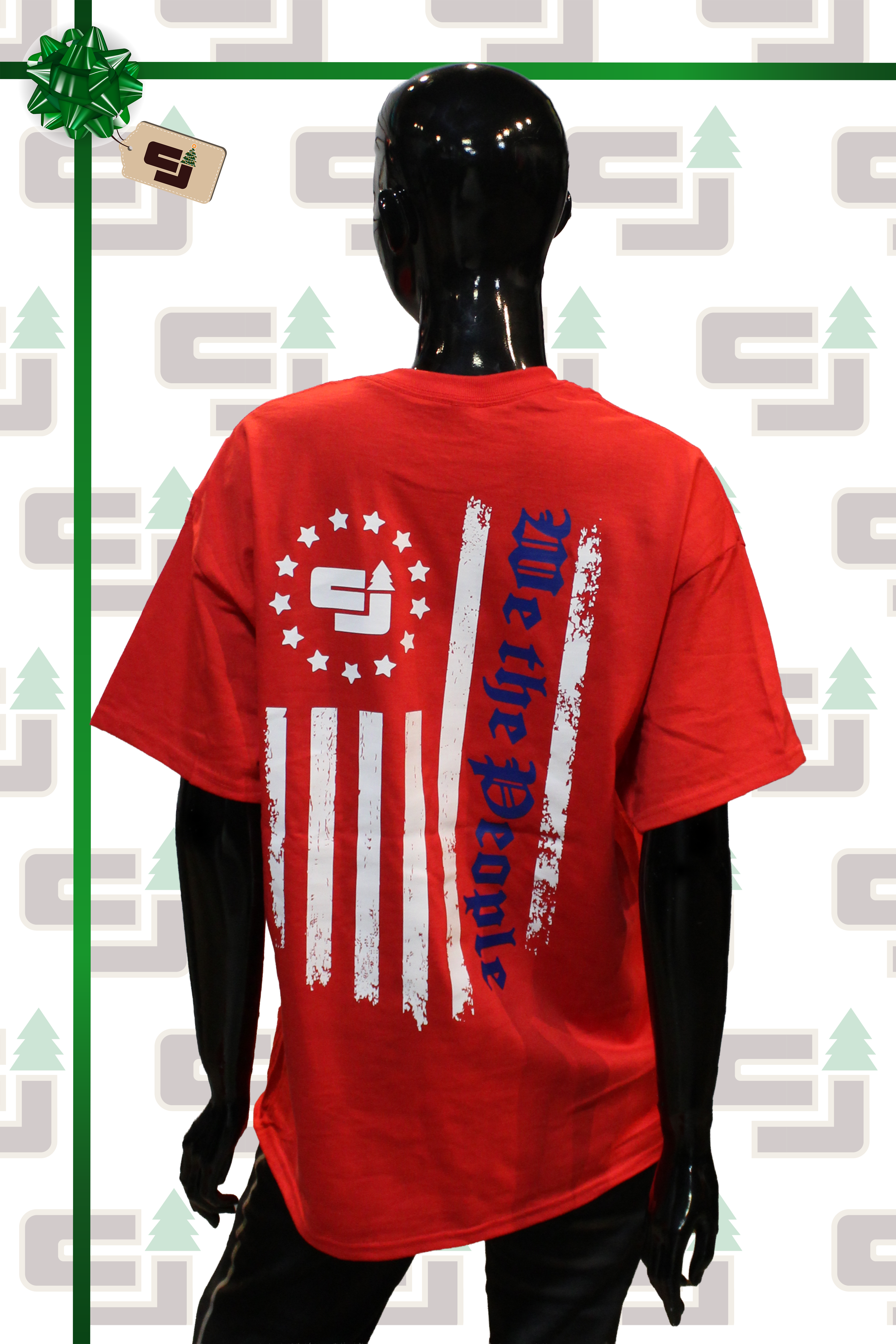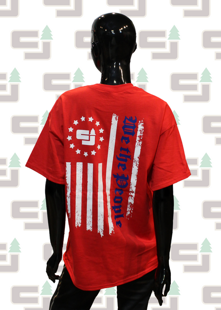 Red colored Team CJ T-Shirt. Includes the CJ logo on the front in white and blue, and "We the People" artwork featuring the CJ Logging Logo on the back, also in white and blue.